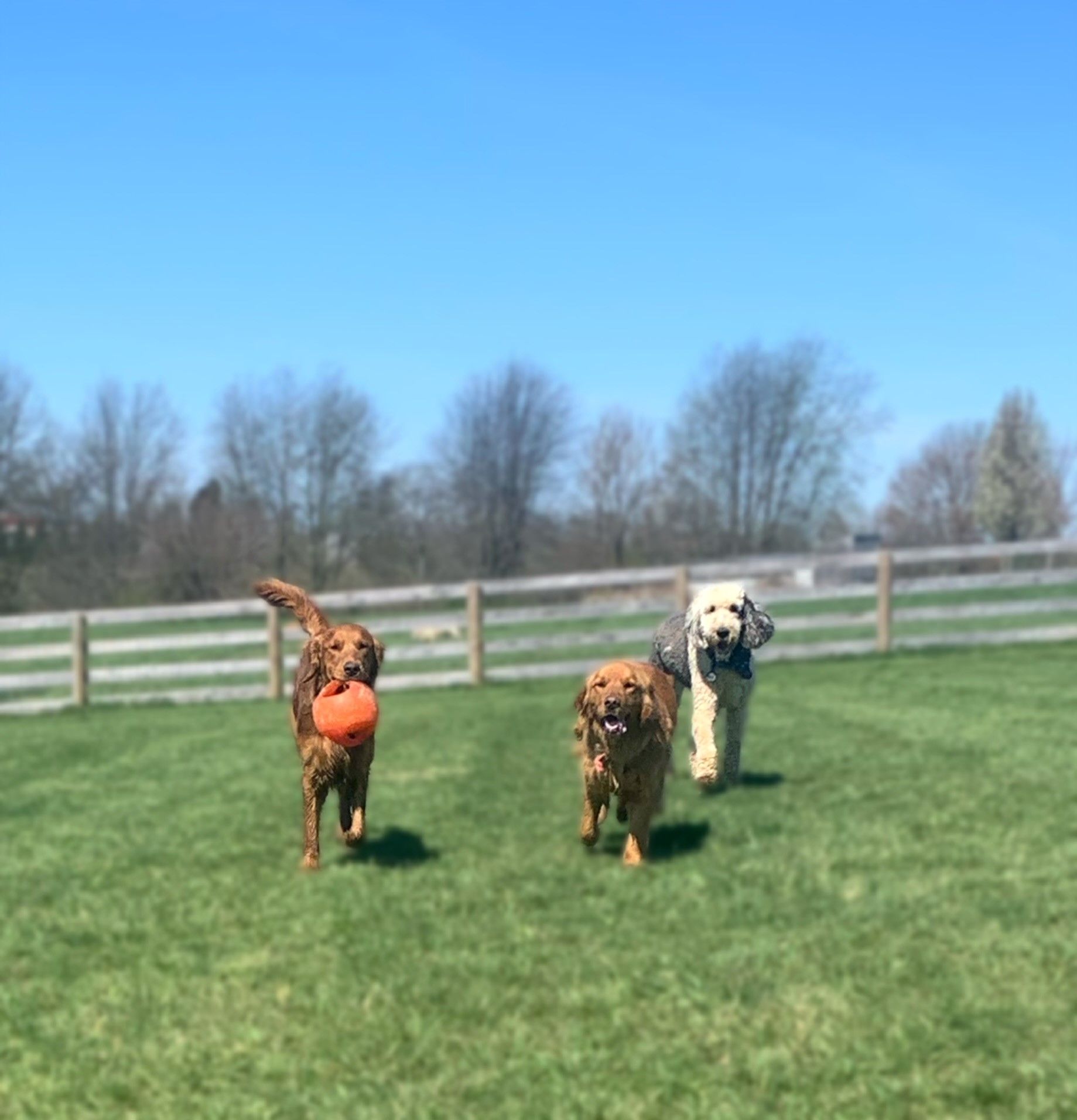 The Bungalow - Positioned at the rear side of The Retreat, the Bungalow is our original play yard. It features a double fence that stands 5' tall and encompasses approximately one acre. It is complete with a shade pavilion, automatic water dispensers, entertainment, and a 450 gallon pool area.