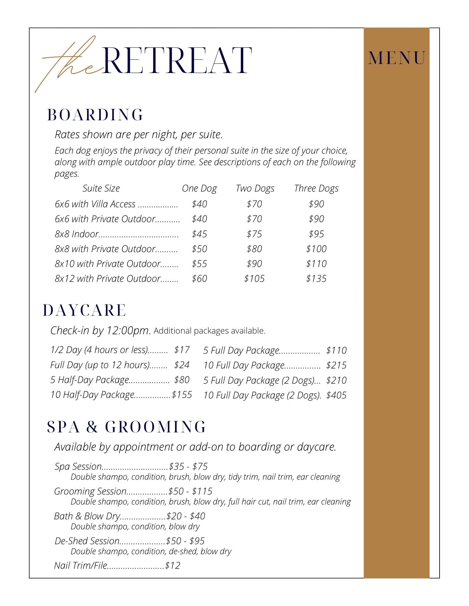 * If you have requested a bath, spa session, full groom, or other service prior to check-out please allow adequate time for completion, as these services aren't performed until the day of check-out.